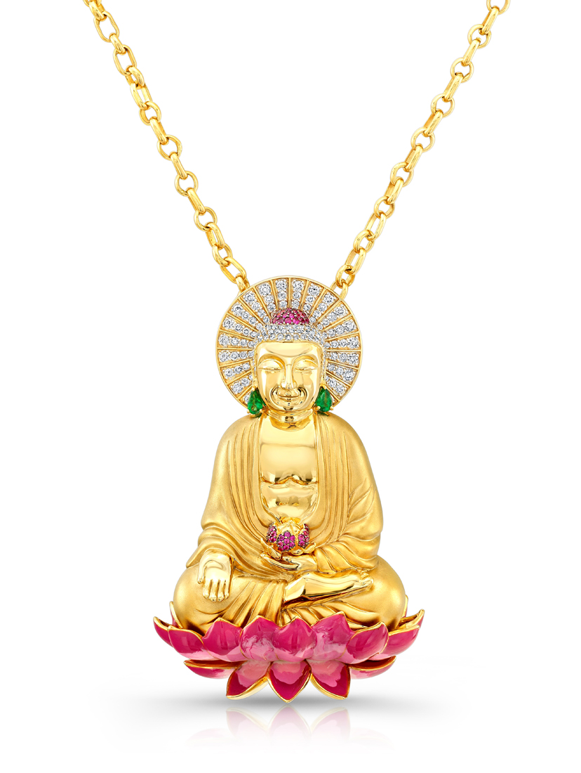 Who knew? Some Buddhas lend themselves more readily to spectacular jewelry than others. For Nancy Badia, the founder of the Buddha Mama line, Amitabha Buddha—who is always portrayed in religious imagery in Technicolor-bright hues—proved particularly alluring.